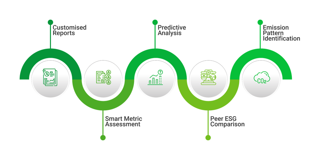 The interactive interface integrates multiple parameters to track and analyse all essential ESG metrics in real-time. It offers individual dashboards for each of the essential ESG metrics to offer detailed insights through easy-to-understand visualisations and simplifies the configuration and calculation of these metrics, aligning all data with the latest GHG accounting standards and ESG reporting frameworks.